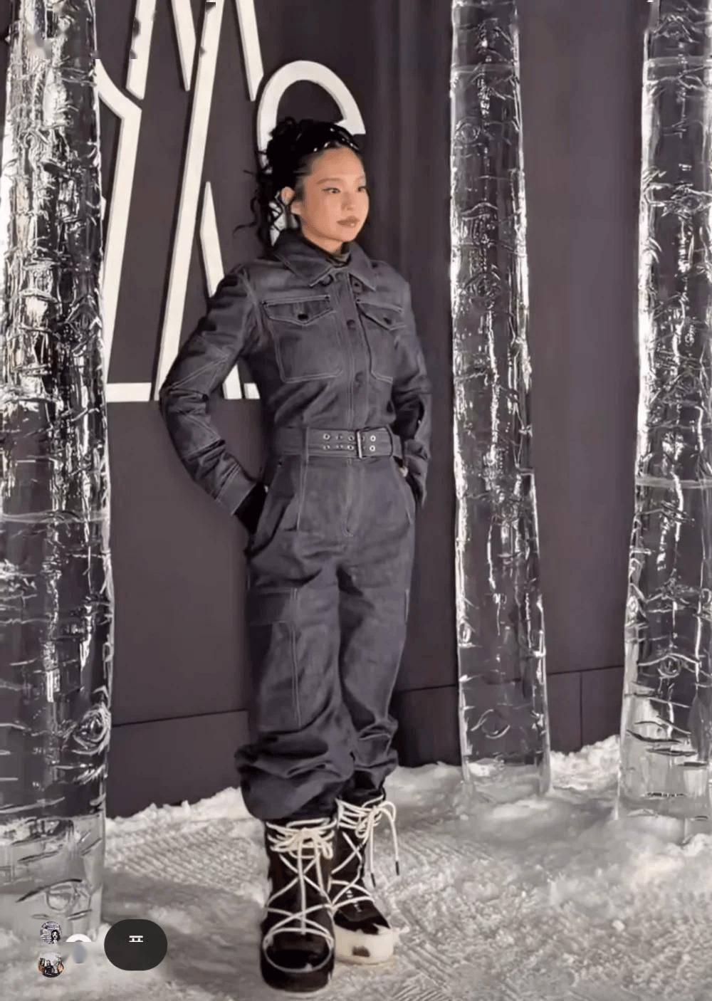 这组为配合户外概念而设计的造型,于2月1日由品牌官方释出。紧接着,Jennie本人身着同款造型现身1月31日在美国阿斯彭举办的Moncler Grenoble大秀。从线上到线下,这套与她过往舞台、写真中甜美或酷飒形象迥异的装扮,被官方定义为“独特的视觉效果”,却在公众端收获了无比复杂的回响。
