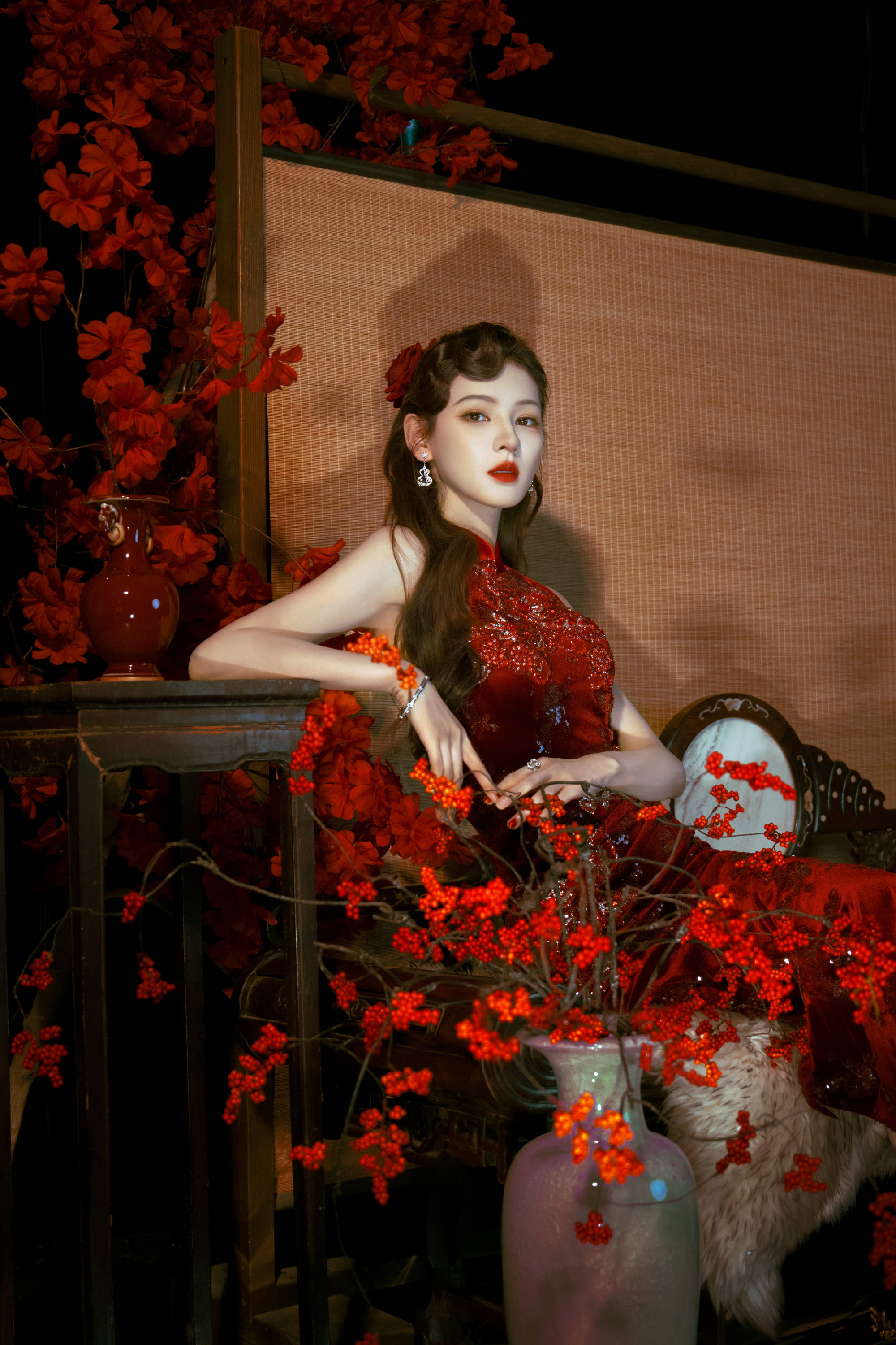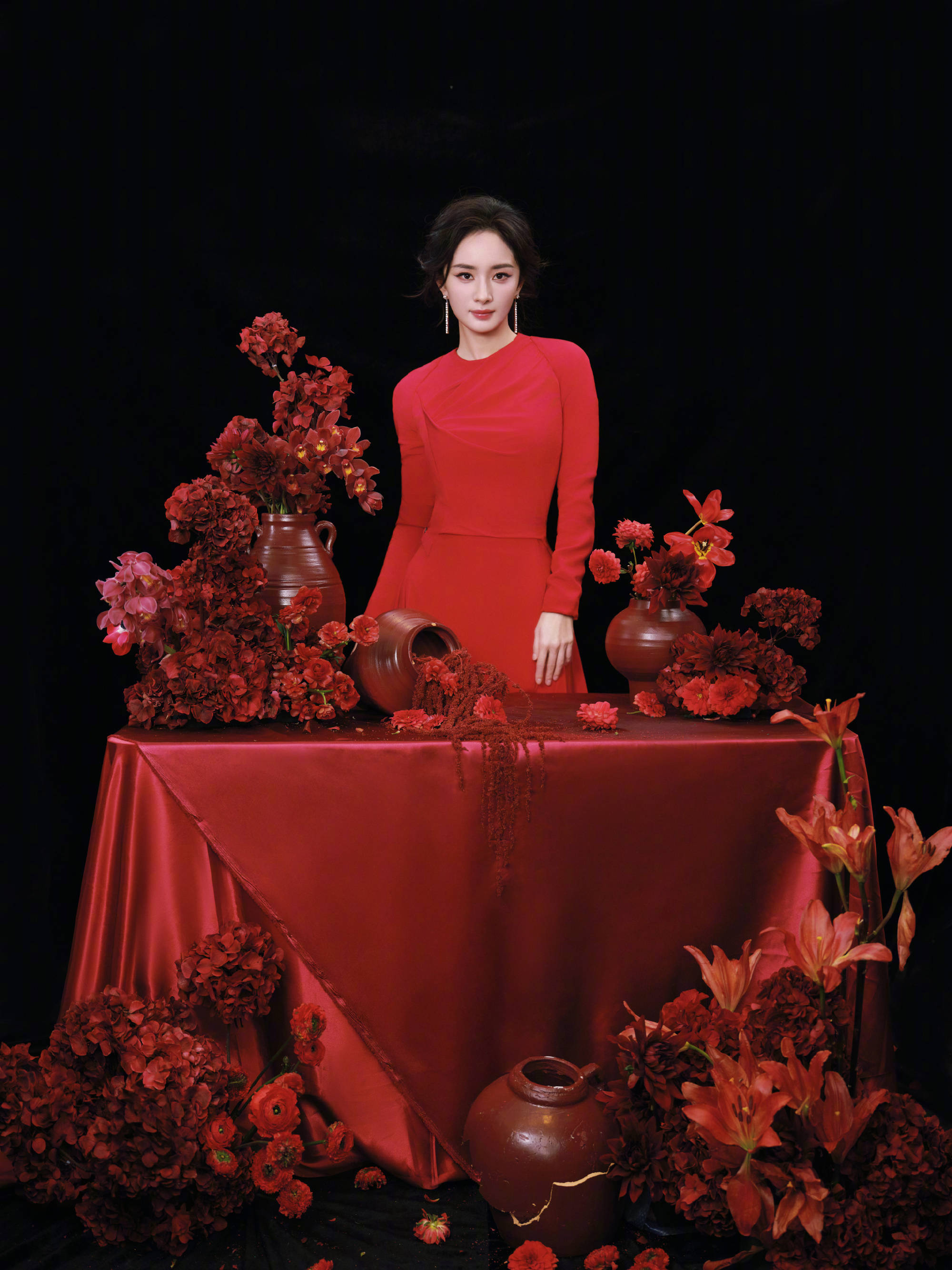 在那一片浓烈如血的红色世界里,色彩的张力已然拉满,可杨幂仍能凭借一袭红裙,强势抢占目光的C位,成为无可争议的焦点。修身的红绸,映衬纤瘦的身段,阔大的裙摆掀起一抹惊心动魄,如一尾金鱼恣意游戏,划破黑色的静谧。倚着巨大的花朵装置,她细长的双腿优雅伸展,露出一小块儿白皙的肌肤,如午夜玫瑰一般,撩拨人心却也克制,散落周遭的花朵,如同为她倾倒的众生,在这绝美时刻增添了几分情趣。