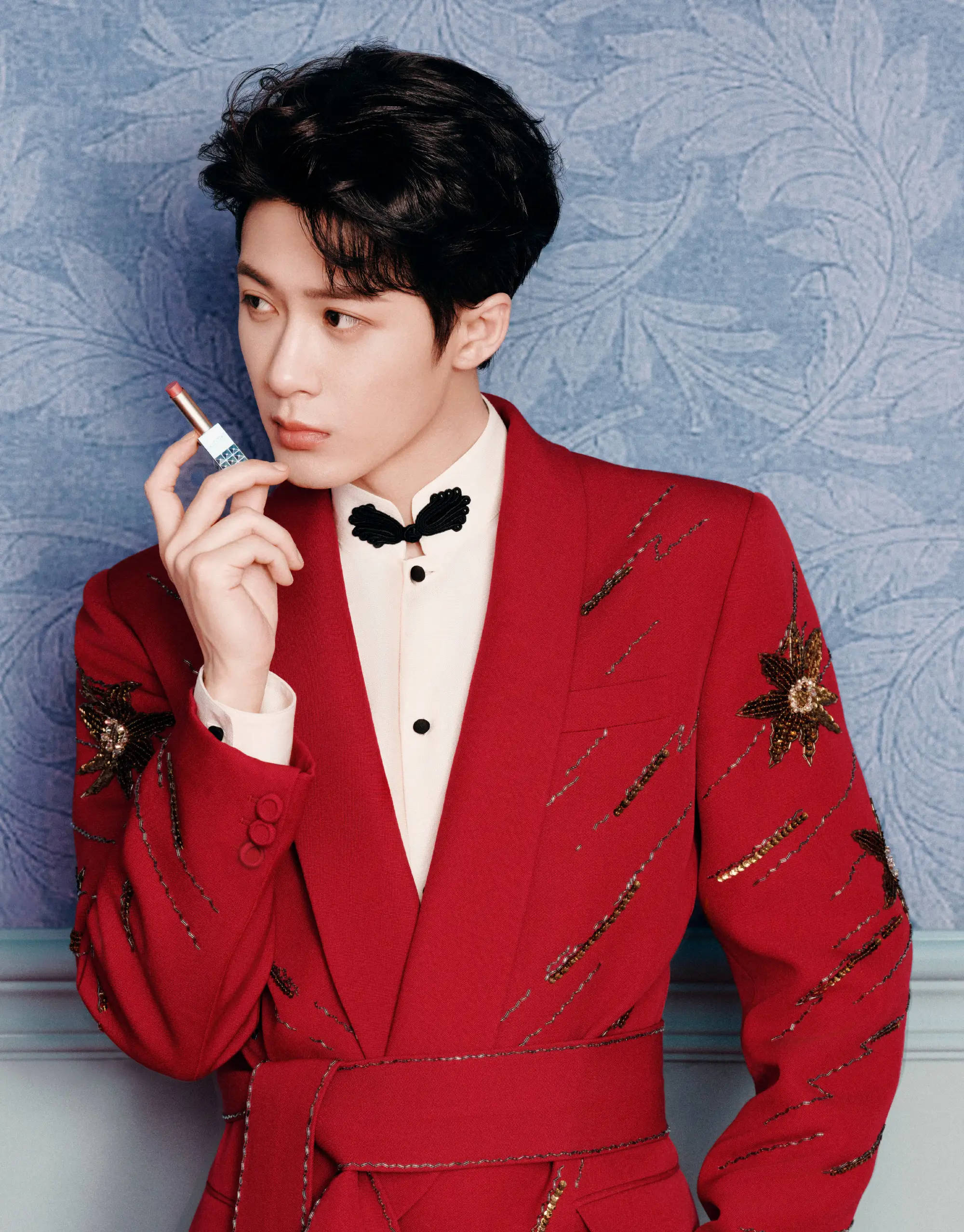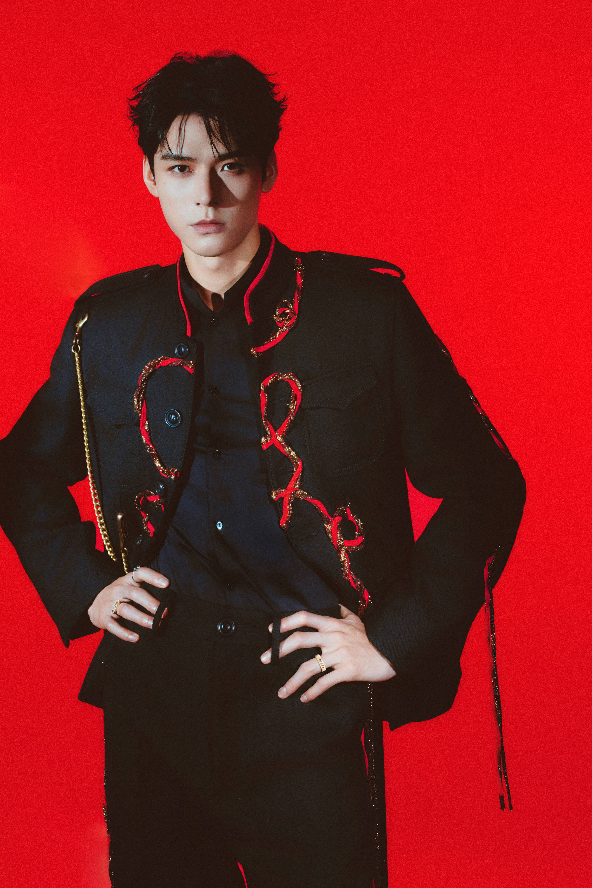 实现了时尚蜕变,龚俊的穿衣不再只追求秩序感,而是强调自我辨识度。黑色的中山装糅合现代元素,老练地增强了青年特有的韧劲儿,酷帅中张力十足。鲜艳的红线勾勒出小立领的轮廓,瞬间唤醒传统服饰里的干练与精气神。衣面之上,金绳红绳交错缠绕,如偾张的血管,炽热醒目。一条简单的金属挂链,定义了光在他身上的弧度,更为整体造型注入了先锋感。脚踩皮靴,剪影中他尽显比例优越,完成了这场既守韵又破壁的前卫表达。