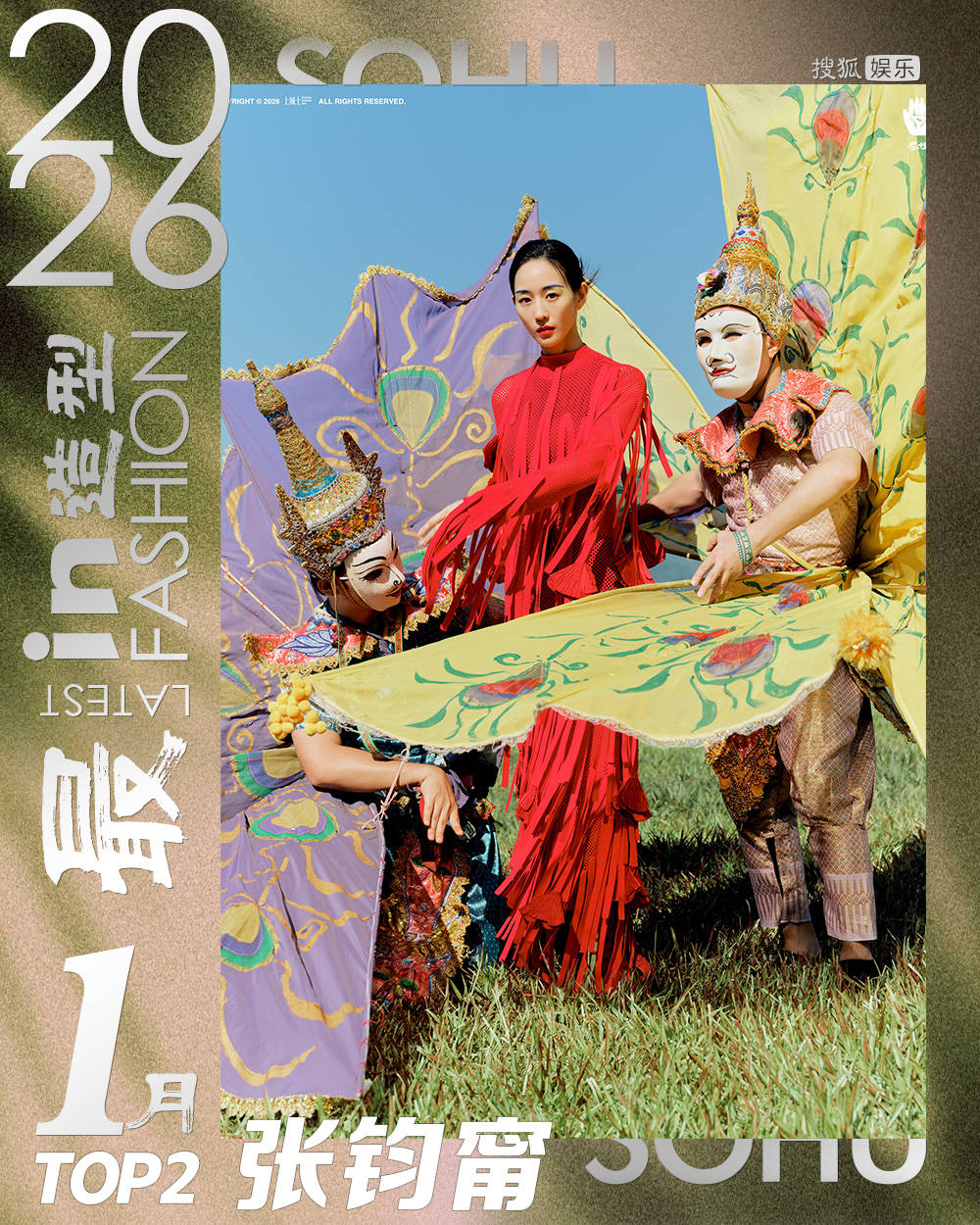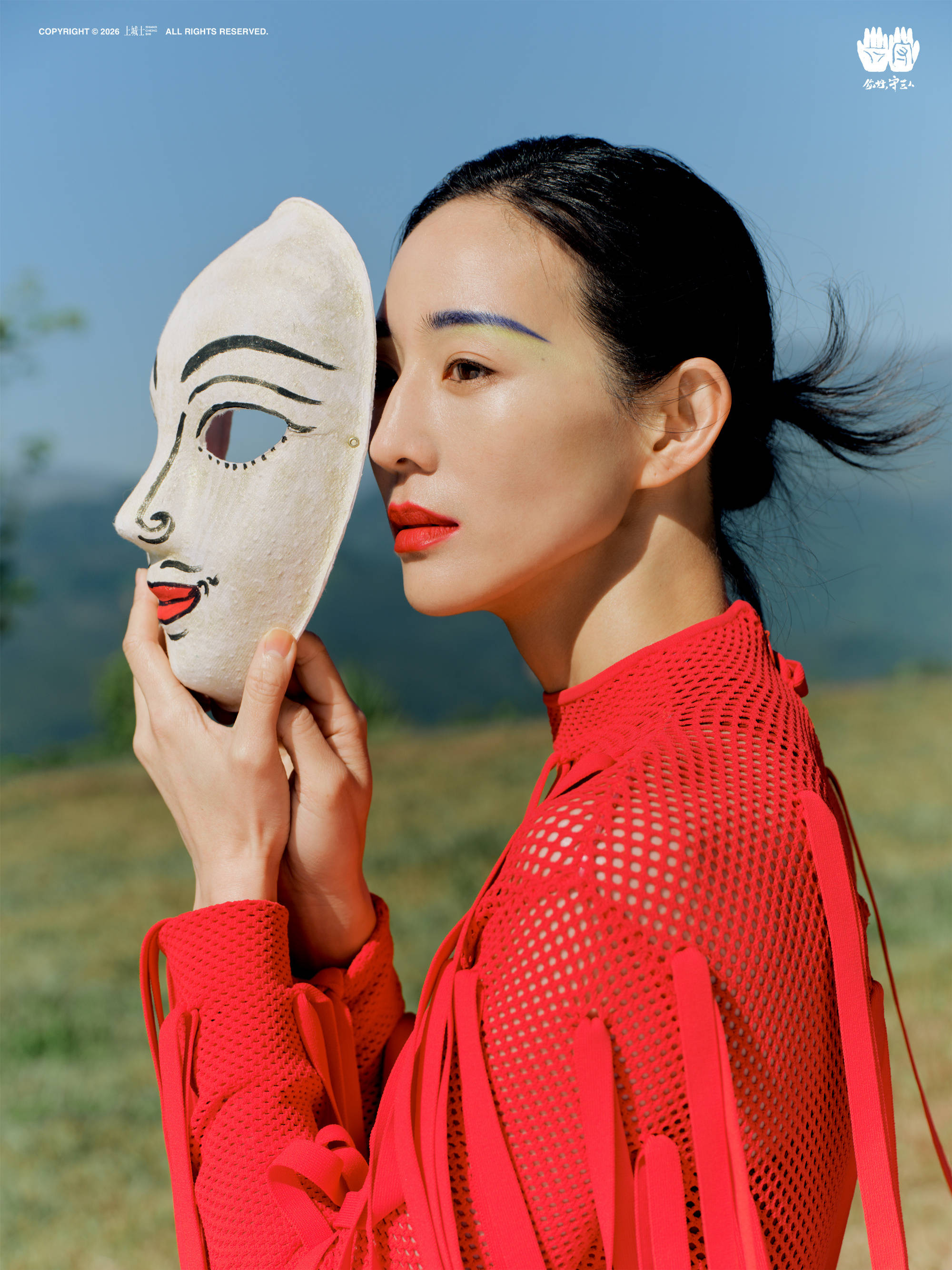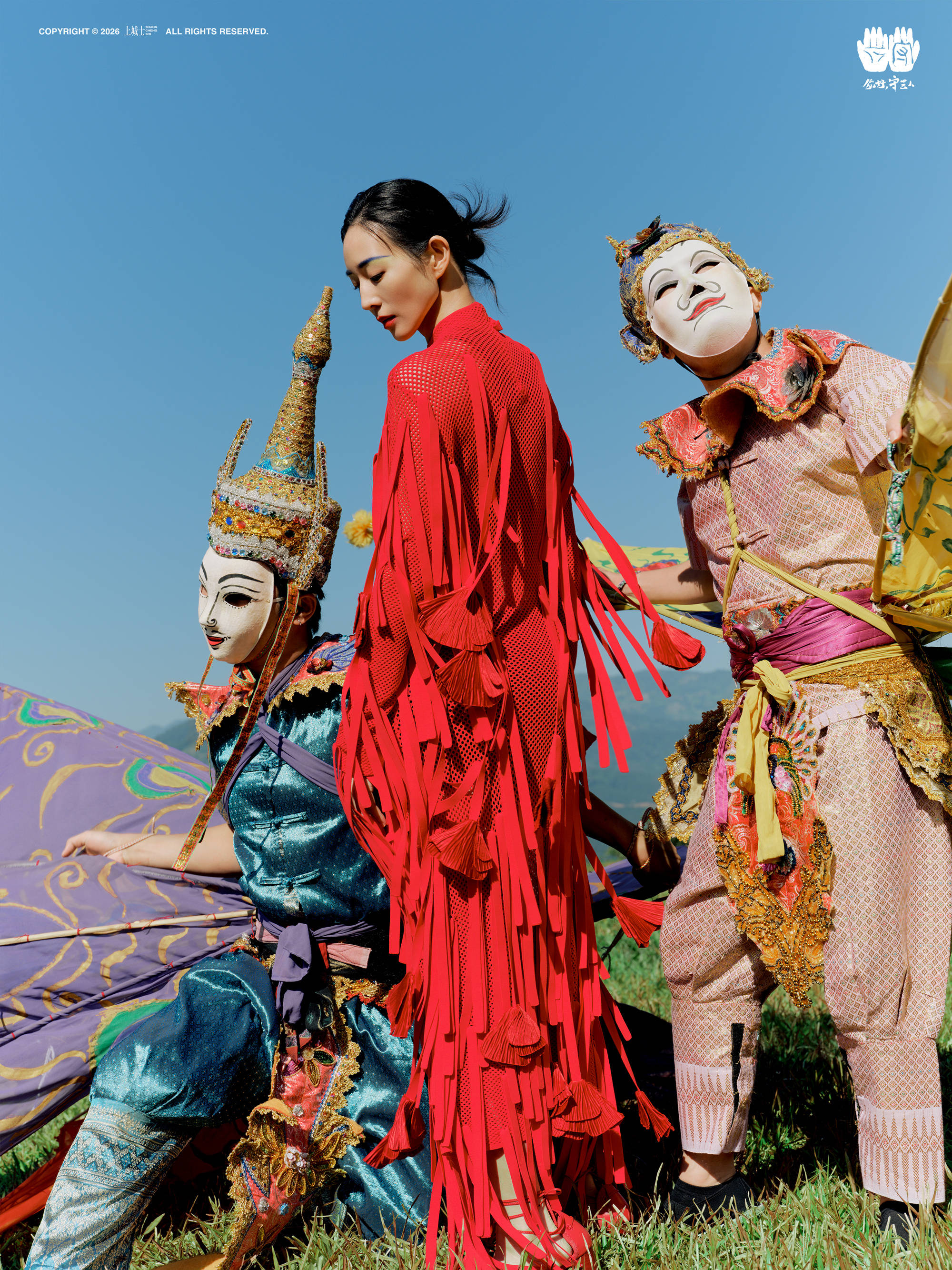 张钧甯的红衣,是东方美学神性的古老回响。阳光直透空气,亮得近乎刺目,落在她身上,仿佛开启某种仪式的一道神谕。鲜艳的长袍,镂空成细密的网,扇形流苏垂落如翎,夹混在尾羽般的布条裙摆中,随风飞甩,让她不曾起舞却自有生命力在衣袂间舒张。发束如冠羽轻颤,面具下方露出古拙的眉眼,为寡素的脸庞注入力量。雌雄神鸟左右共舞,跳起紧那罗,夸张的身姿裹挟着诡秘气场。喧闹之中,她这抹“纯粹”热烈到失真,明明只是静伫中央,却制造出了与雨林葳蕤、山鬼木魅共谋谲诡的浪漫。