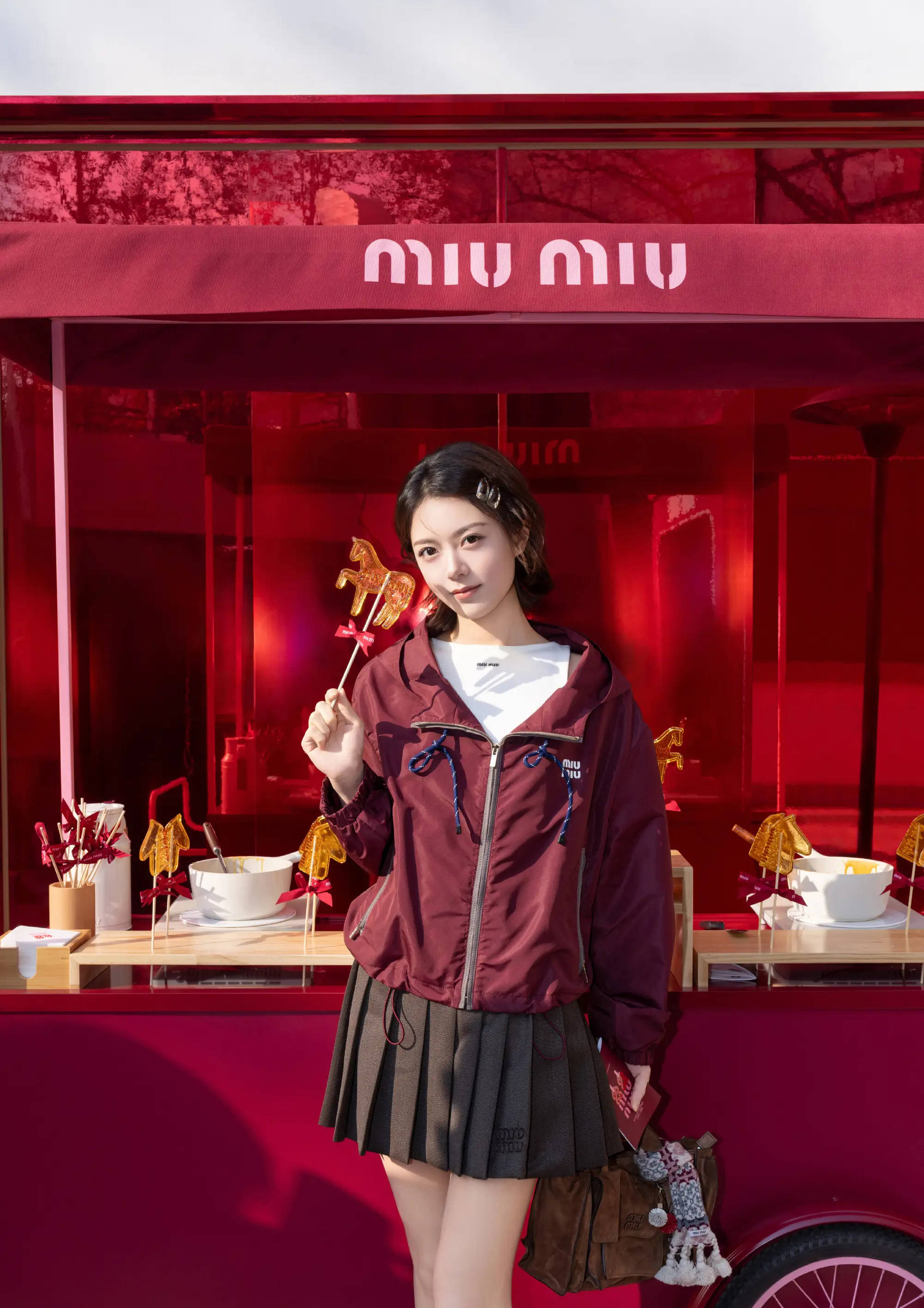 赵今麦这一身,是Miu Miu少女的绝佳演绎。酒红冲锋衣带着松弛的户外感,深灰百褶裙提高露肤度,带来呼吸感。内搭一字领白T,干净又清爽,脚上一双长筒靴则精准平衡了甜酷感。站在快闪车前,她手持琥珀色的糖画小马歪头微笑,一副甜而不腻的青春气派。
