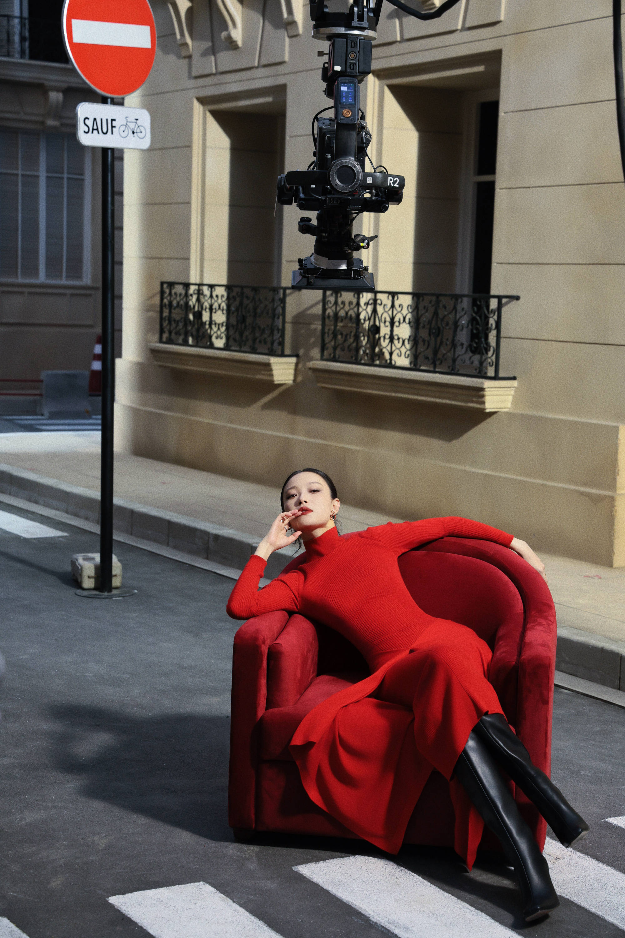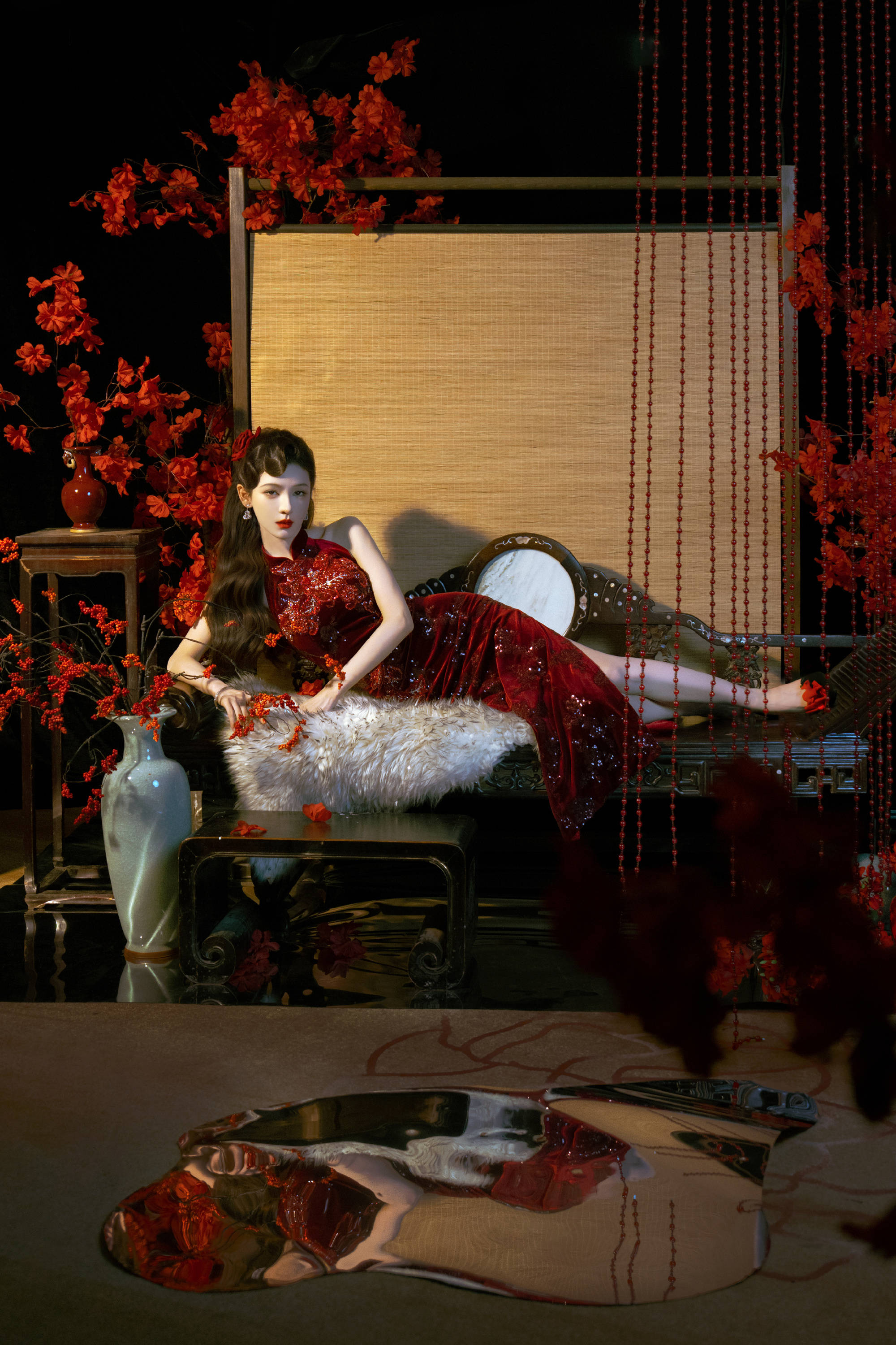 焦黄的光投射在素雅的竹屏风上,张予曦斜倚床边,邀人共赴红楼绮梦。色彩浓郁的短绒旗袍,妖冶胜血,泛起微光,质感华贵而雍容。钉珠组成的花朵,以暗纹提花为影,攀爬着纤细的脖颈和款款腰肢,在冷白肌肤的映衬下,竟产生了奇妙的攻击性。梳着老上海手推波,张予曦混血感的五官因而也有了一份异次元的精魅感。乱舞的红花,如鬼魅摄魄,恨不能施展所有身法,几欲吞噬空间。地上一滩银液,歪歪扭扭地倒影着所有,恰如“朦胧见,鬼灯一现,露出桃花面”,叫人虚实难辨。