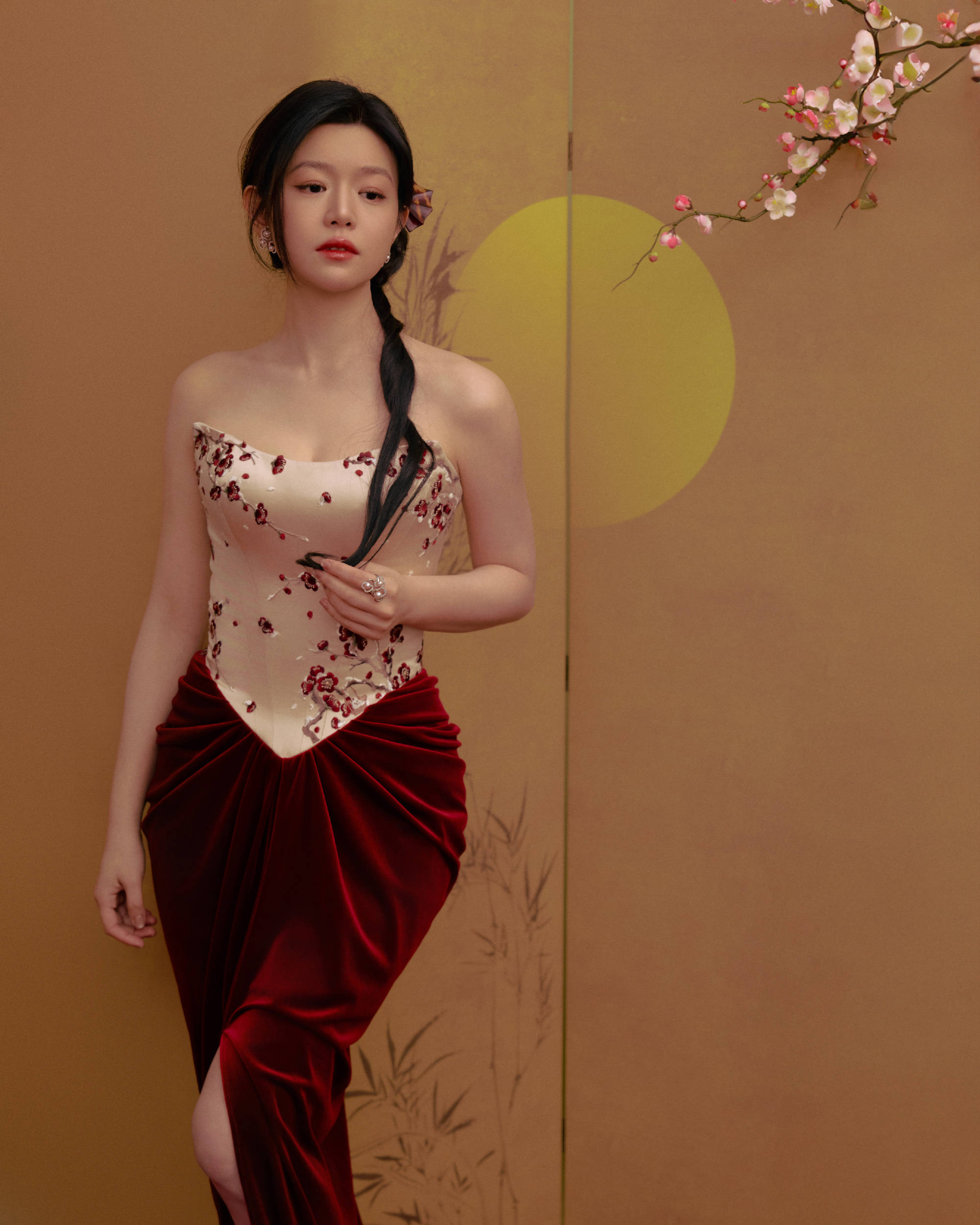 陈妍希一袭新中式包臀裙,好似从画卷里走出的美人。鹅黄色的绸缎抹胸,如泛旧的宣纸铺陈,细腻中带着古典韵味。立体的红梅刺绣旁逸斜出,将淡然的妙趣凝练成最具意象的视觉符号。华丽的丝绒包裹起双腿,修饰出瓷瓶一样的腰臀,款步走动,不经意间露出几分妩媚,别有成熟的风情。乌黑的长发挽在一侧垂下,为画面带来一笔墨色,她站在中式屏风前,成就诗意的留白。