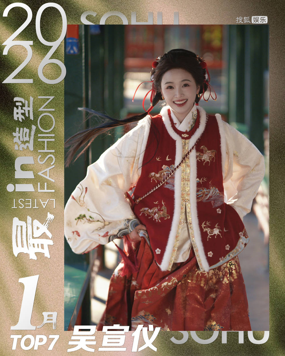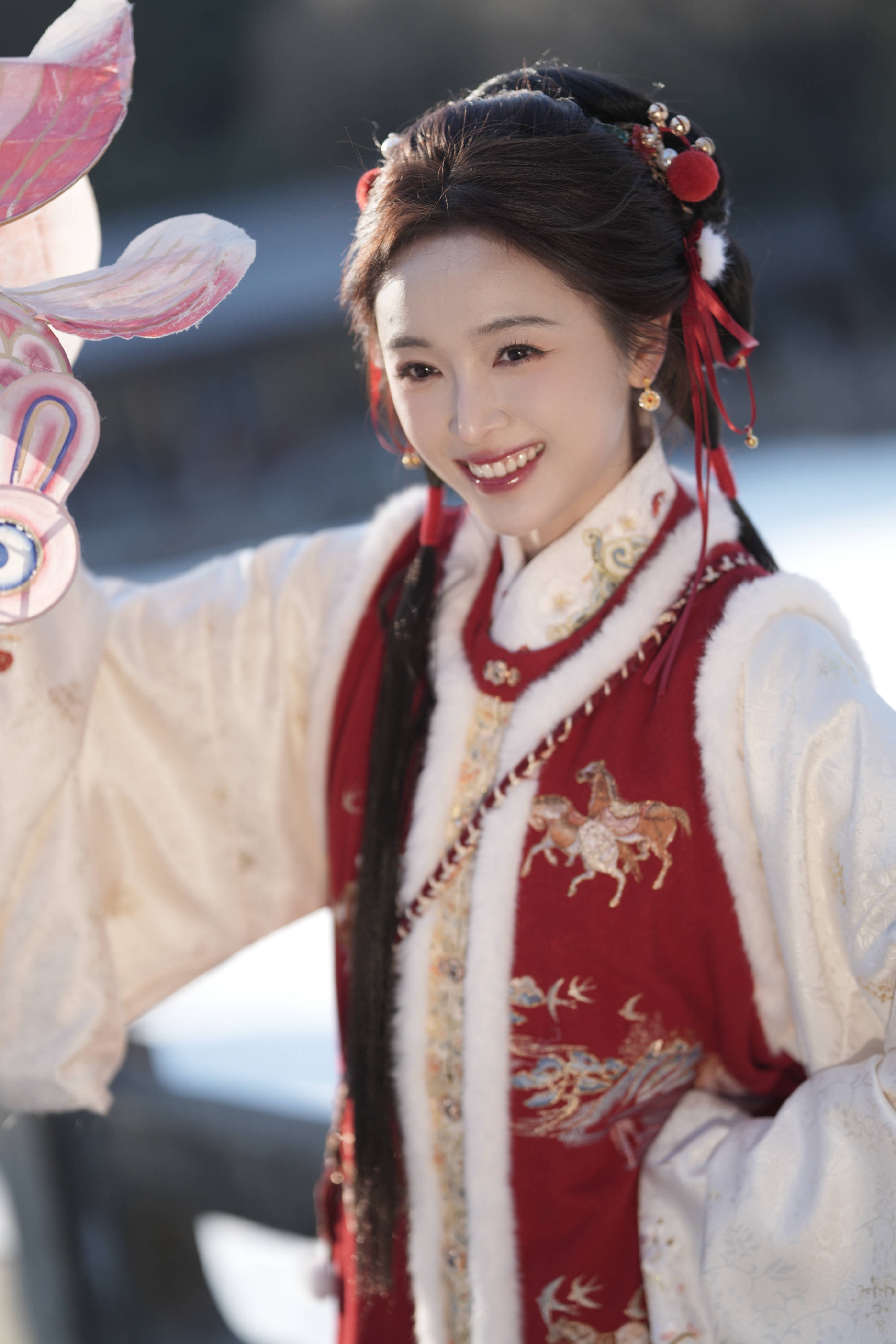 红装吴宣仪,绝对是国风爱好者的天菜!精美的明制汉服,交领右衽暗合“敬天法祖”的礼仪,外搭的水华红马甲,刺绣着山川骏马,还有飞燕点缀,庄重之余有些许俏皮。规整的马面裙,褶裥彰显着风雅的秩序感,或妆花或织金,满是华美的纹饰,直接把吉庆的年味焊在了身上!戴着以非遗花丝工艺编制出的“灵转八宝”耳饰,挎着小马包,可爱的小毛球点缀在发间,别有种青春稚气的美好。从连廊上飞奔而来,她纯真而稚气的笑容简直成了中国节日的顶配表达,小家碧玉的样子比雪地里的腊梅还要鲜活。