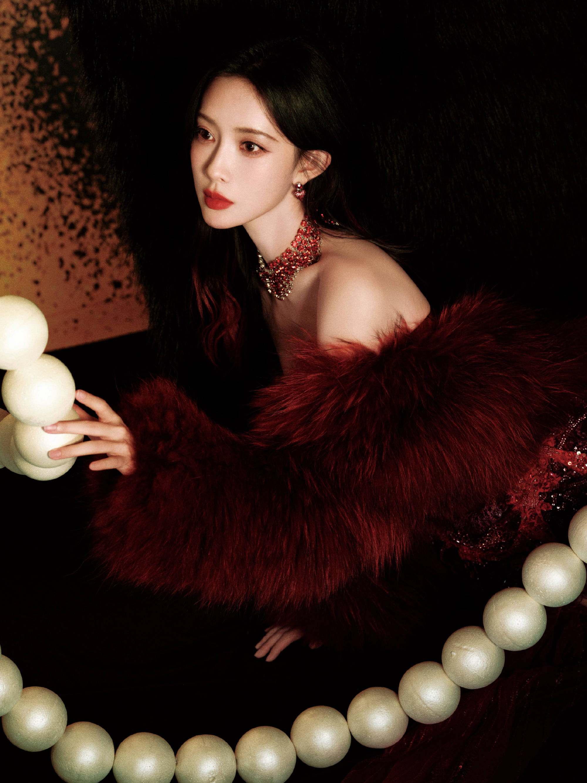 孟子义出手,实力永远在线。酒红的皮草一扫冬日乏味,斜垮着秀出薄肩,大胆展露着优美的天鹅颈。半掩着的亮片裙,漾开粼粼光泽后拖出一条薄纱,贴心地让颜色有了浓淡之别,还增添了一点朦胧感。重工的红珠宝颈链,如血珀滴落,大红唇与之相映成趣,简直媚骨天成。手抱复古收音机,画面再次产生反差,孟子义轻松让女神感落地,有了一丝烟火气。