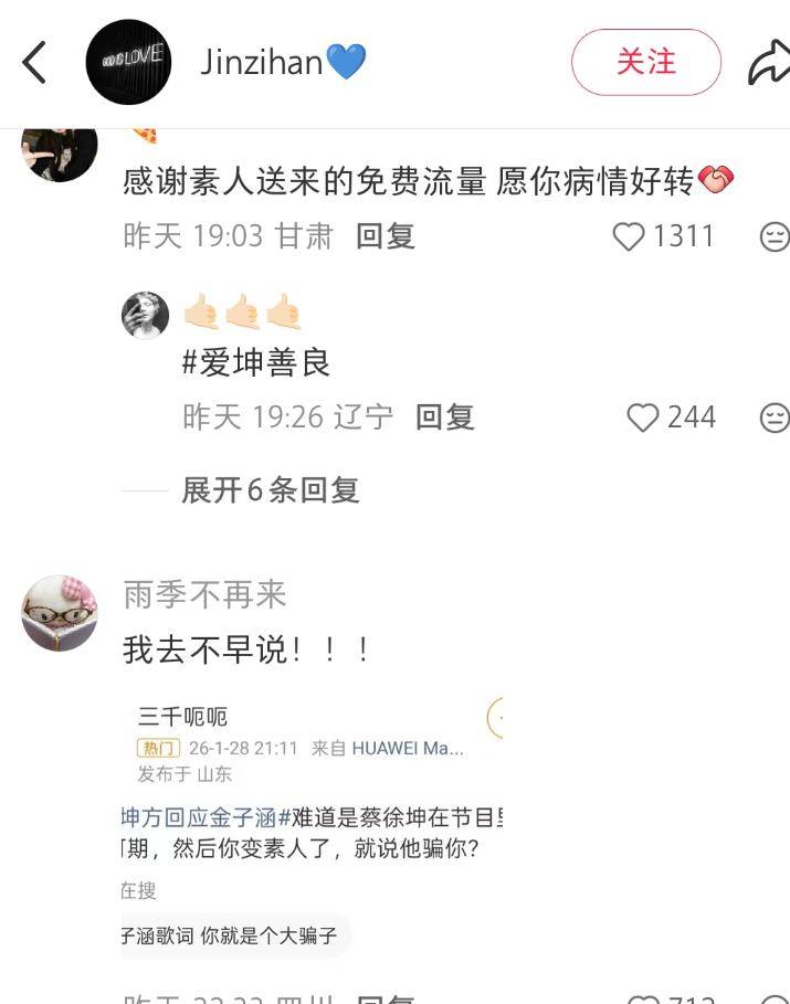 而在蔡徐坤方辟谣之后,金子涵可以说是两头不讨好,单凭她这几张图片也无法断定她和蔡徐坤之间的联系,更像是一个人单方面的发泄。