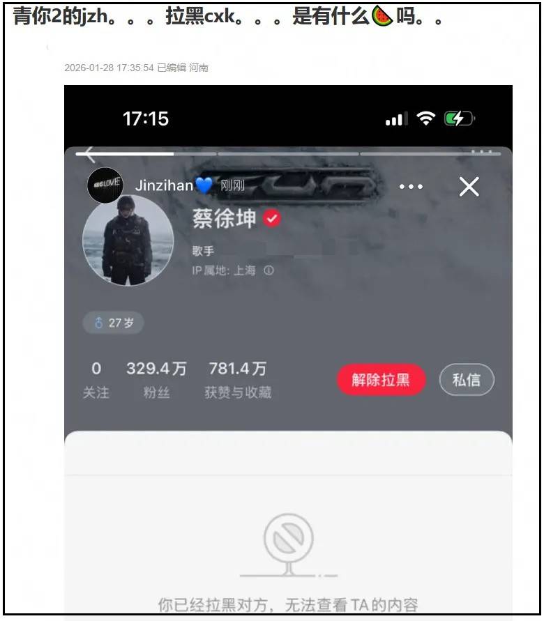 退圈许久的金子涵最近爆出自己拉黑蔡徐坤的截图,还连续发了有暗示性的表情和文案,不仅上了热搜第一吸了一大波热度,还引起了网友对他俩的恋情猜测。