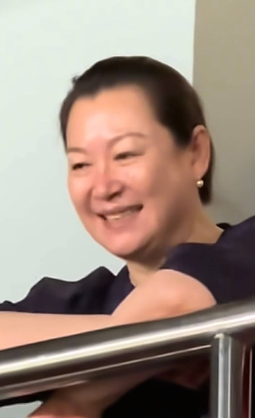 上身一件黑上衣,下身一条黑裤子,就靠珍珠耳环和戒指稍微点缀了一下,看着特别端庄,满脸都是福气相!