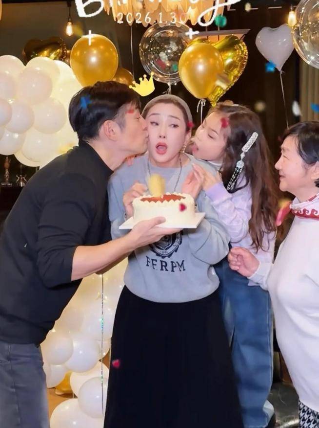 等吹完蜡烛,严屹宽直接跟女儿同步动作,俩人手忙脚乱往杜若溪脸上亲。