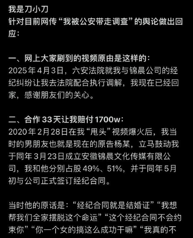 去年4月份,“刀小刀”被警察带走的消息冲上热搜,随即各种负面消息齐至。相隔一天后,刀小刀亲自发文解释被带走的原因,据其透露,她在爆火之后与前男人的公司签订了合同,但伴随着相处,她发现与前男友不管是性格还是其他方面都不合适,所以便选择分手。