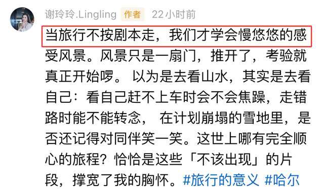 “当旅行不按剧本走,我们才学会慢悠悠的感受风景,风景只是一扇门,推开了,考验就真正开始了,以为是去看山水,其实是去看自己……”