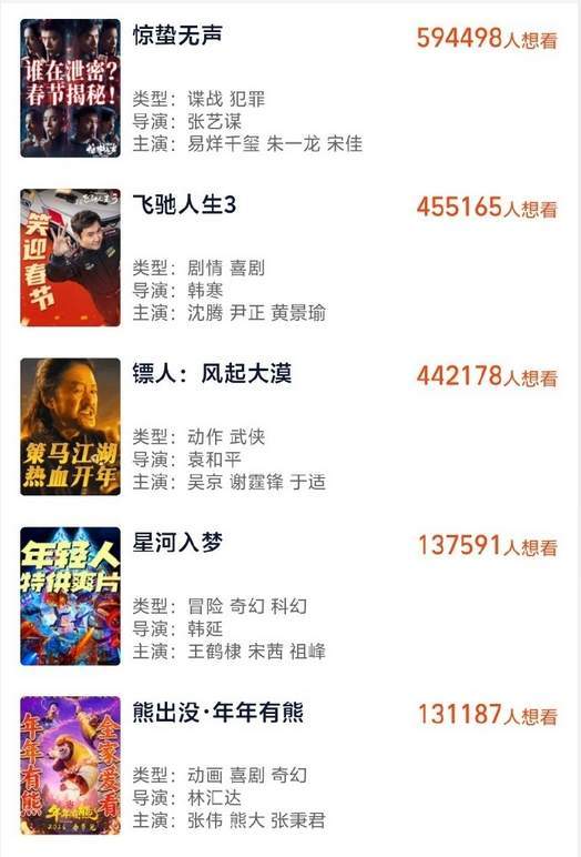 《转念花开》撤了。张艺谋的《惊蛰无声》是主旋律谍战,题材沉重。吴京的《镖人》是武侠,受众有限。《熊出没》稳归稳,但天花板看得见。