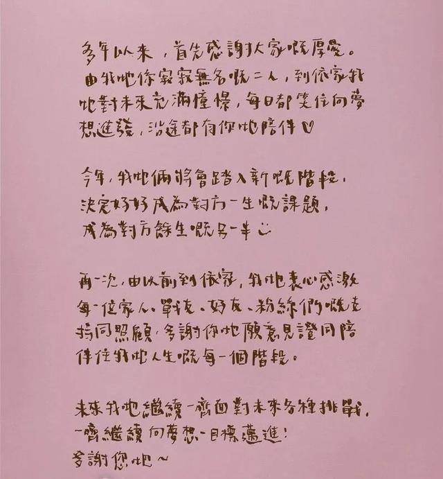 在甜蜜公告中,邱士缙与Alina以亲笔手写信表达真挚情感︰「多年以来,首先感谢大家的厚爱。由我们俩是寂寂无名的二人,到现在我们对未来充满憧憬,每天都笑着向梦想进发,沿途都有你们陪伴。」