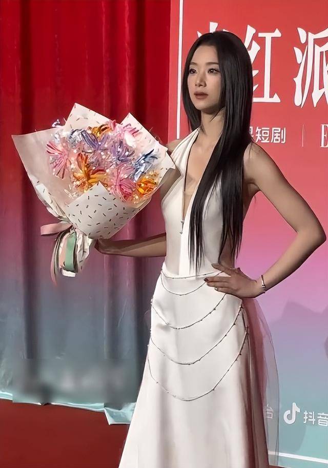 但她身材纤瘦,秀出锁骨和手臂线条,肚子上隐约能看见马甲线,可身高太矮,即便穿恨天高,也撑不起礼服气场,看着像是个小孩一样。