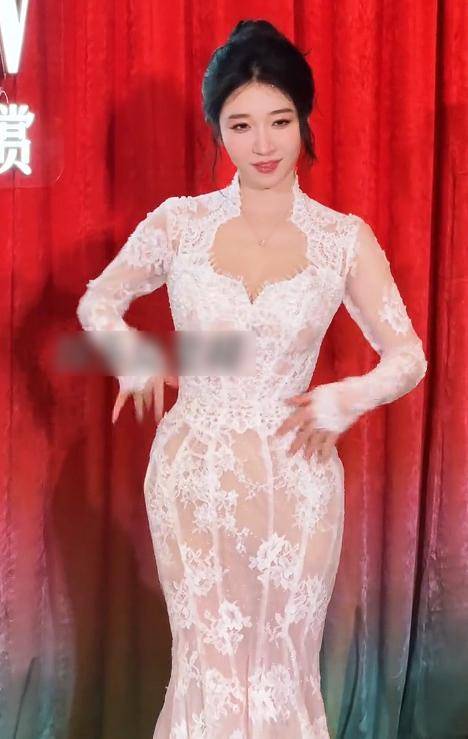 这次她穿一身白色蕾丝鱼尾裙,想走“美神降临”路线,却用力过猛翻了车。