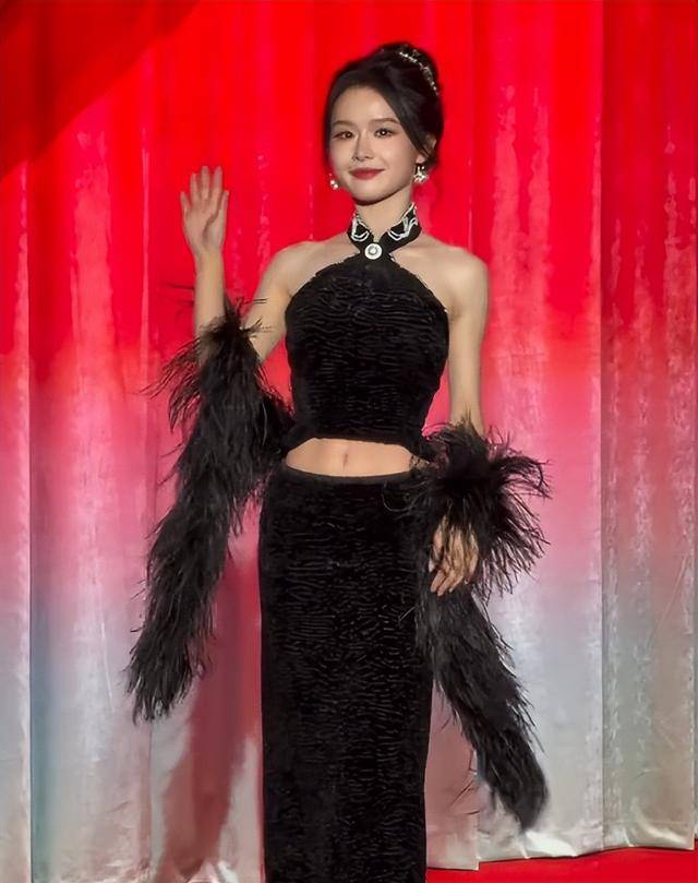 只见她穿着一身黑色的挂脖抹胸裙,手腕羽毛设计仙气飘飘,走性感路线。