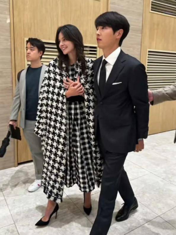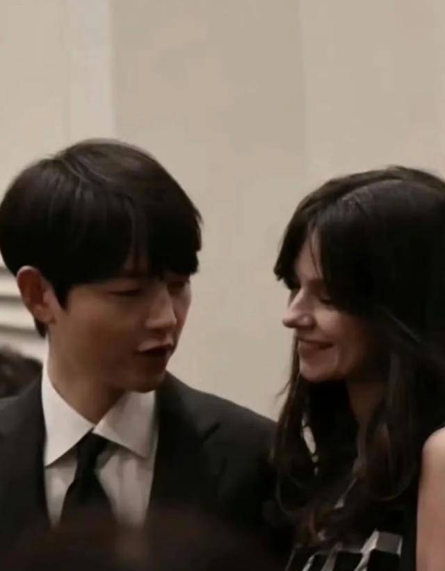 两人要么并肩站着听新人致辞,要么低头小声说话,偶尔对视的时候,宋仲基的眼神里还带着笑,那种自然的亲密感,不是装出来的。