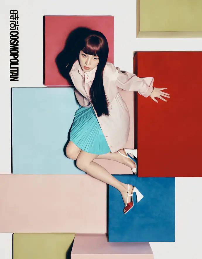 先看这张躺在彩色方块上的造型,我的天!浅粉色衬衫配湖蓝色百褶裙,外面还套了件同色系外套,这撞色也太大胆了吧!但宋雨琦居然hold住了,还穿出了少女感,漫画里走出来的女主角!她脚上那双高跟鞋也很有设计感,白色鞋跟配红色鞋头,上面还有金色搭扣,细节感满满。