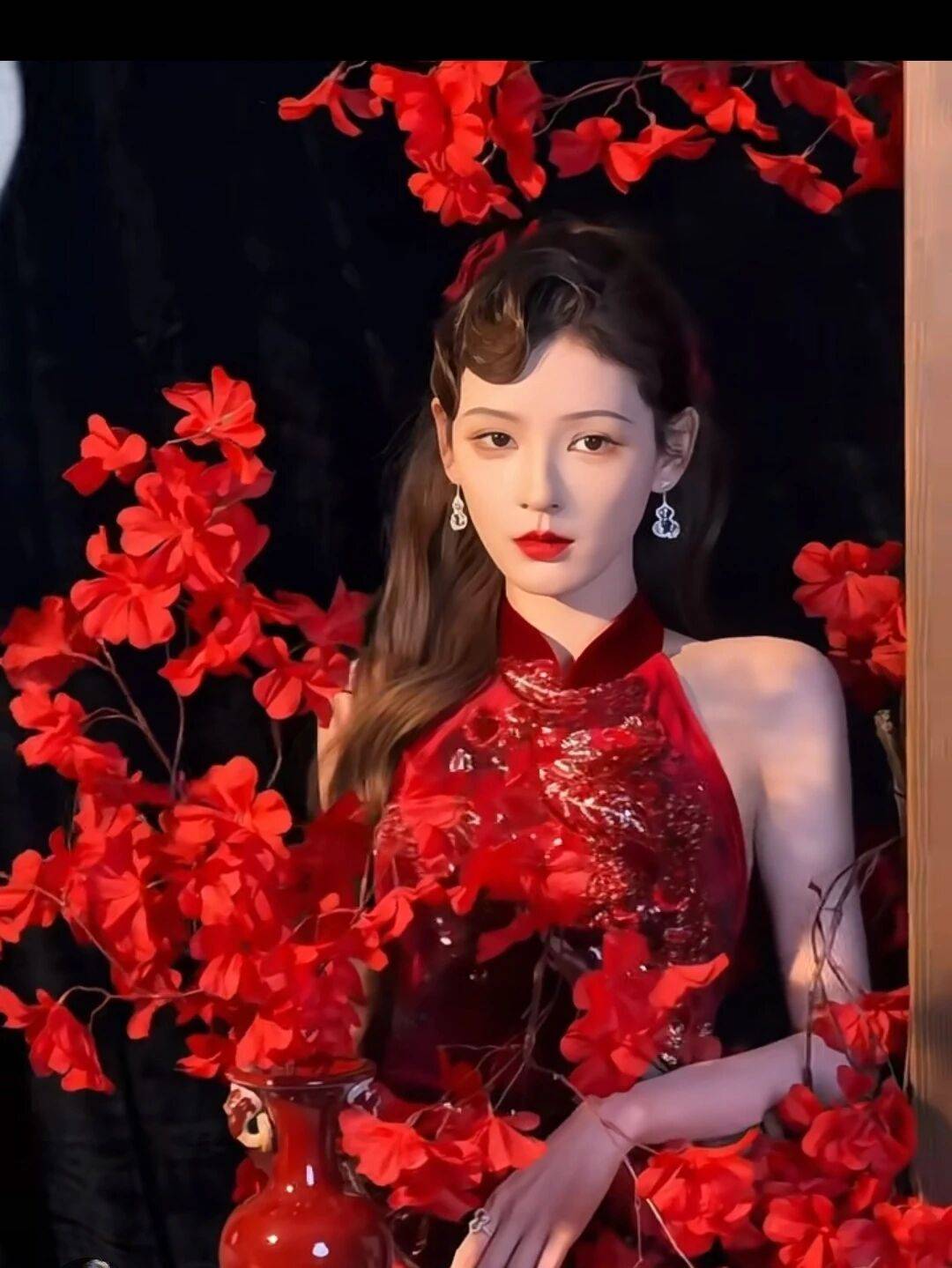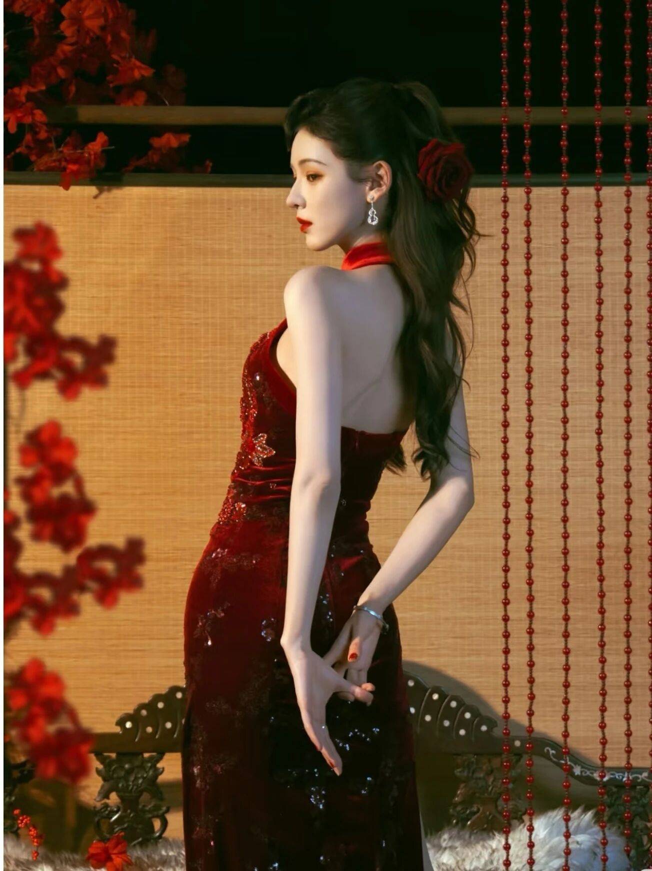 先看这条旗袍的设计,也太绝了吧!酒红色丝绒面料高级感满满,上面绣满了红色亮片花纹,在灯光下闪闪发光,领口的立领设计显得脖子又细又长,露背剪裁更是大胆又性感。最吸睛的是她的发型,复古大波浪卷发配上红色花朵发饰,简直就是旧上海画报里的摩登女郎!她站在红色花丛中那个眼神,又纯又欲,这谁顶得住啊!