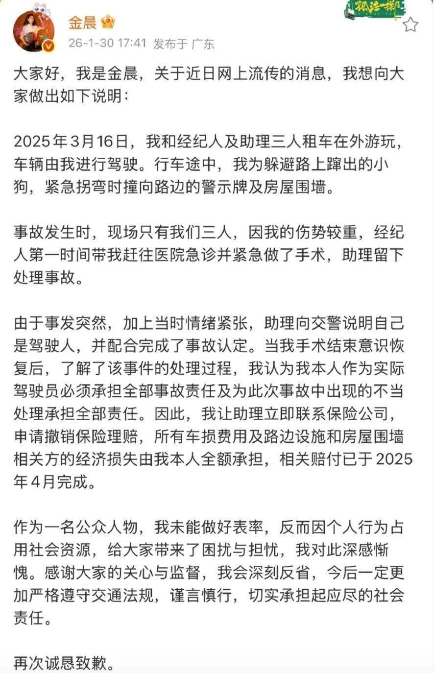紧接着金晨本人发长文道歉,晒出脸部受伤的照片,说当时撞得太狠要紧急手术,才让经纪人陪着去上海看病,留下助理处理现场,还强调 “手术一醒就让助理撤了理赔,自掏腰包赔了所有钱”,赔付早在去年4月就结了。