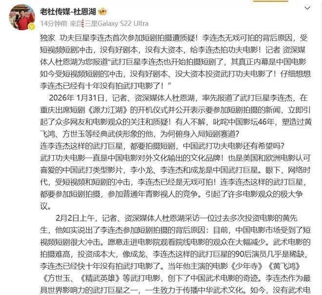 1月31日,重庆的寒风里突然炸开个大新闻 —— 资深媒体人杜恩湖甩出独家消息:李连杰要拍短剧了。