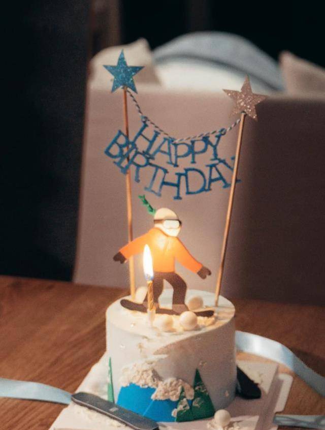 蛋糕是滑雪主题,侧面是奶油做成的雪山,顶上一个穿着橙色滑雪服的小人,正在奋力下坡滑行,那正是酷酷的缩影。