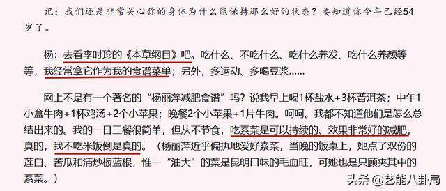 接受媒体专访时,杨丽萍曾说自己不吃米饭,经常把《本草纲目》作为食谱菜单。