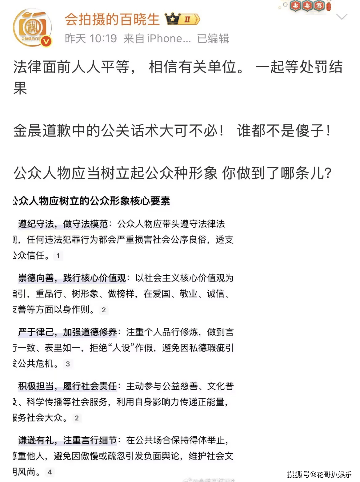 粉丝自然是第一时间下场护主,把娱记骂得狗血淋头,说他是敲诈勒索不成反破防,像条疯狗一样咬住金晨不放,甚至扒出娱记过往的爆料黑历史试图转移焦点。但客观说,这次娱记放出的证据可以说是有理有据。首先,金晨这边的道歉声明里只提撤销保险报案,却没说是否主动向交警更正驾驶员身份?所谓避让小狗实质证据吗?助理谎称肇事者,金晨作为当事人真的完全不知情吗?她这次的事难道真的能靠她轻描淡写的一份公告就掀过去了。
