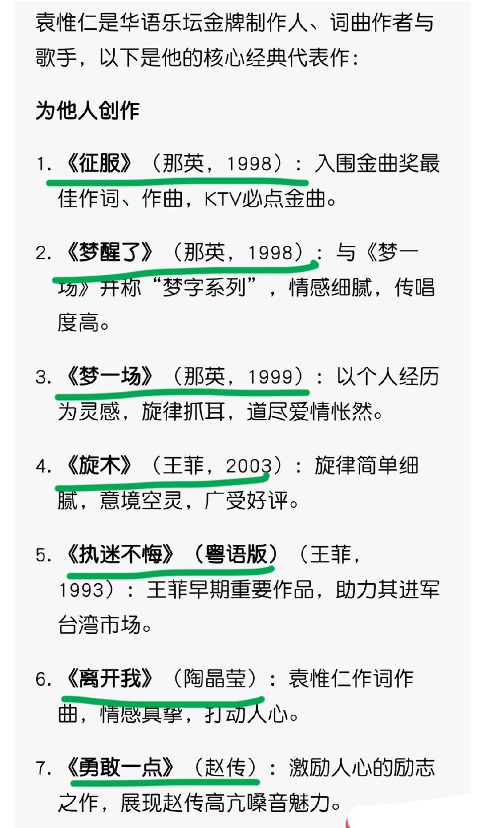 王菲的《执迷不悔》和《旋木》,那英的《征服》和《梦醒了》《梦一场》,赵传的《勇敢一点》,陶晶莹的《离开我》,都是袁惟仁的代表作,也是他留给人间的音乐回响。