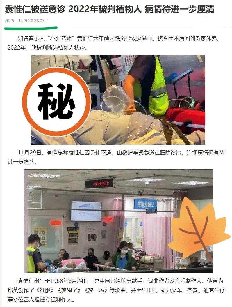直到2025年11月,袁惟仁得了肺炎只能再次转入加护病房。
