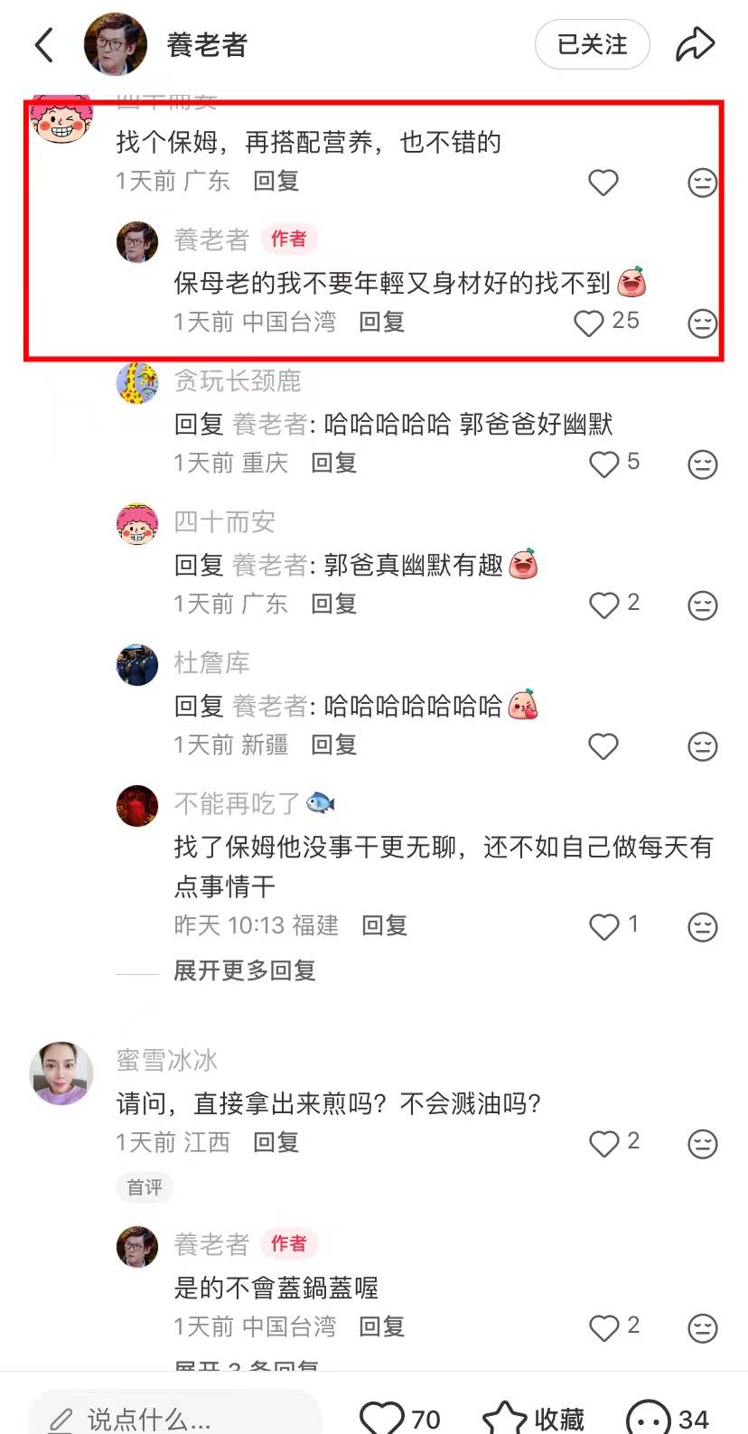 可能他一个人在家,网友劝他找个保姆,做菜营养搭配,但郭爸爸表示,老的不想找,年轻又身材好的找不到。网友都认为郭爸爸很幽默,如果郭碧婷给爸爸找个保姆照顾他,一定会认真考察,找个信得过的,这个年纪找的是保姆,而不是伴侣,所以郭爸爸幽默回复网友,还是很逗。