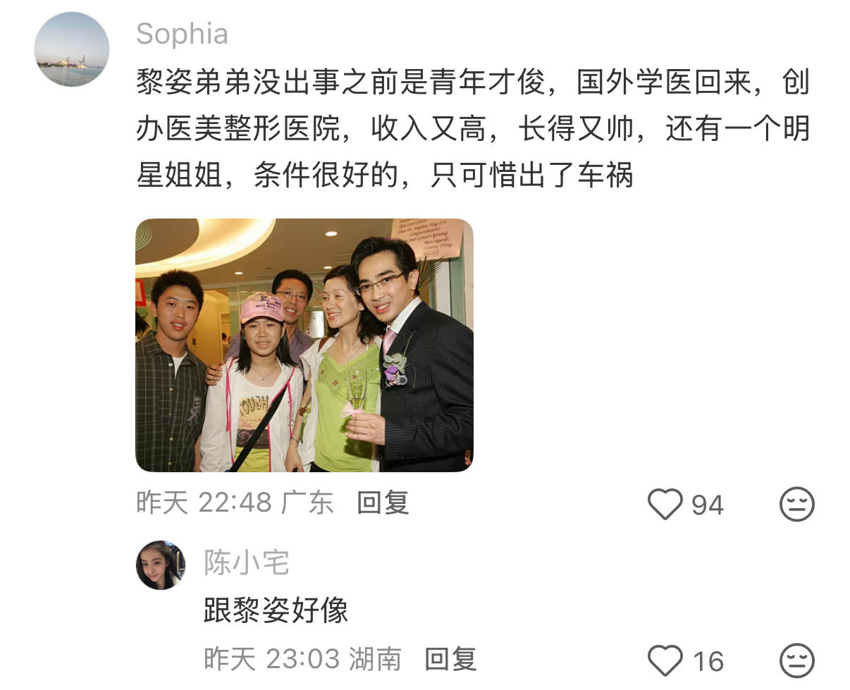 黎姿和弟弟的感情也很深,她14岁辍学就是为了供弟弟黎婴读书。从香港中文大学医学院到英国皮肤科硕士,黎婴曾对姐姐说“以后我养你”。