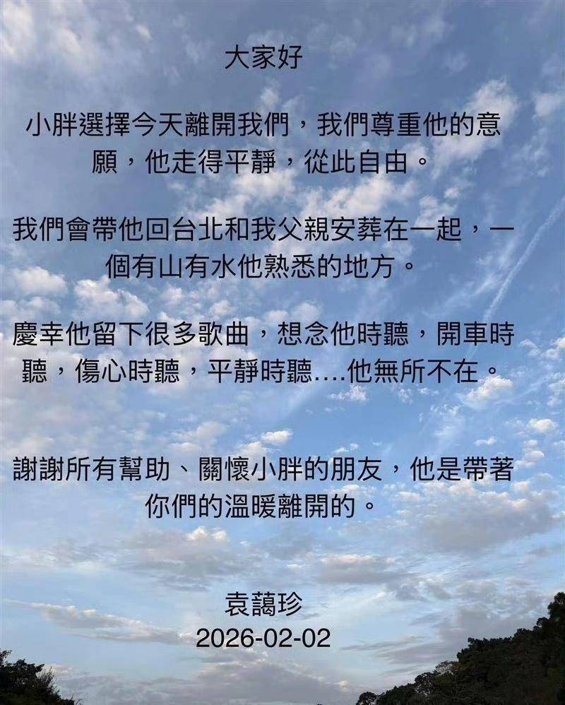 袁惟仁的姐姐袁蔼珍很快发布讣告,字里行间满是不舍:“小胖选择今天离开我们,走得平静,从此自由”。后续会把他带回台北,和父亲合葬在一处有山有水的熟悉之地。
