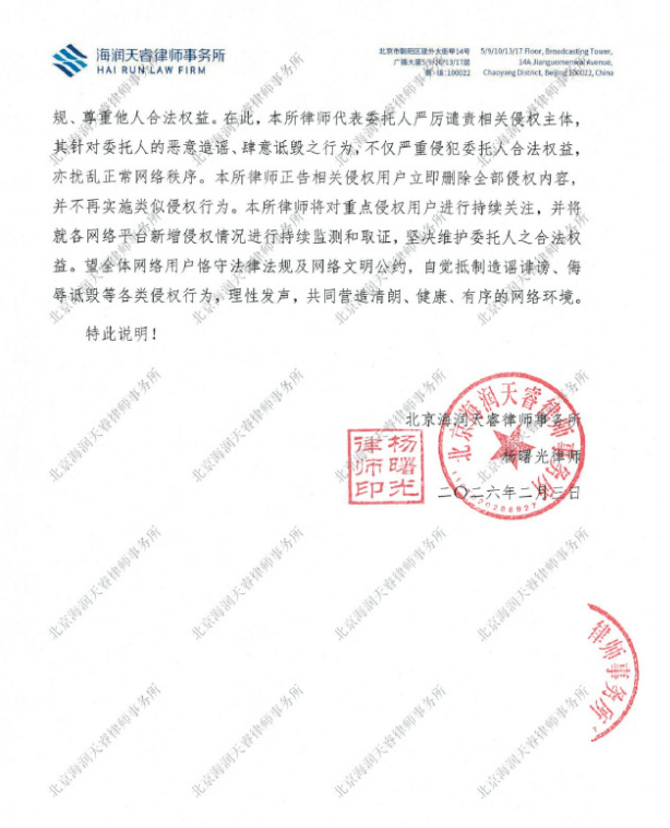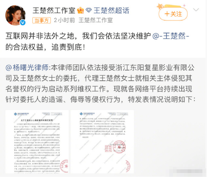 2月3日,演员王楚然委托律师发告黑声明。随后王楚然工作室转发表示:“互联网并非法外之地,会依法坚决维护艺人的合法权益,追责到底!”