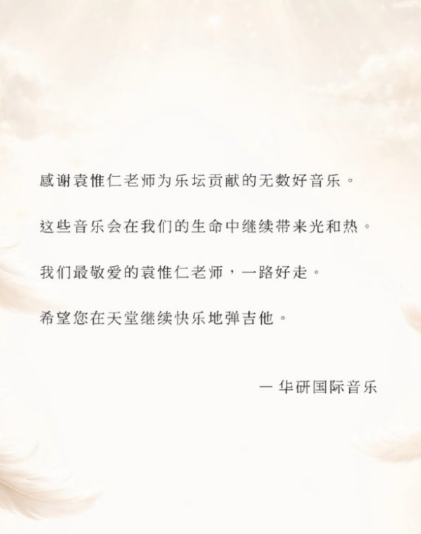 2月3日,华研国际音乐悼念袁惟仁,感谢他为乐坛贡献无数好音乐,希望他在天堂继续快乐地弹吉他。