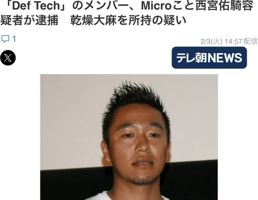 2月3日,据日媒,音乐双人组合Def Tech成员、以Micro为艺名活动的西宫佑骑(45),因在自家持有干燥大麻,已被警方逮捕。