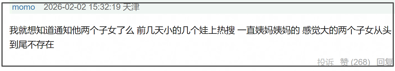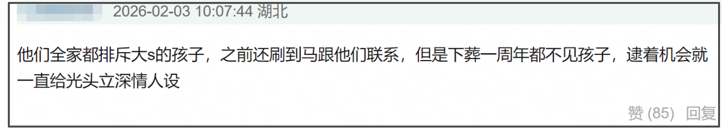 大S下葬时S家就没有通知孩子,现在一周年也没有通知,不止一位网友发现,S家似乎有意无意地将大S子女排除在外,小S和S妈一直口口声声说在乎大S,非常想念她,但对于大S最爱的两个孩子,却没有人提及和在意,亲妈的所有悼念都把孩子完全排除,令人难以理解。