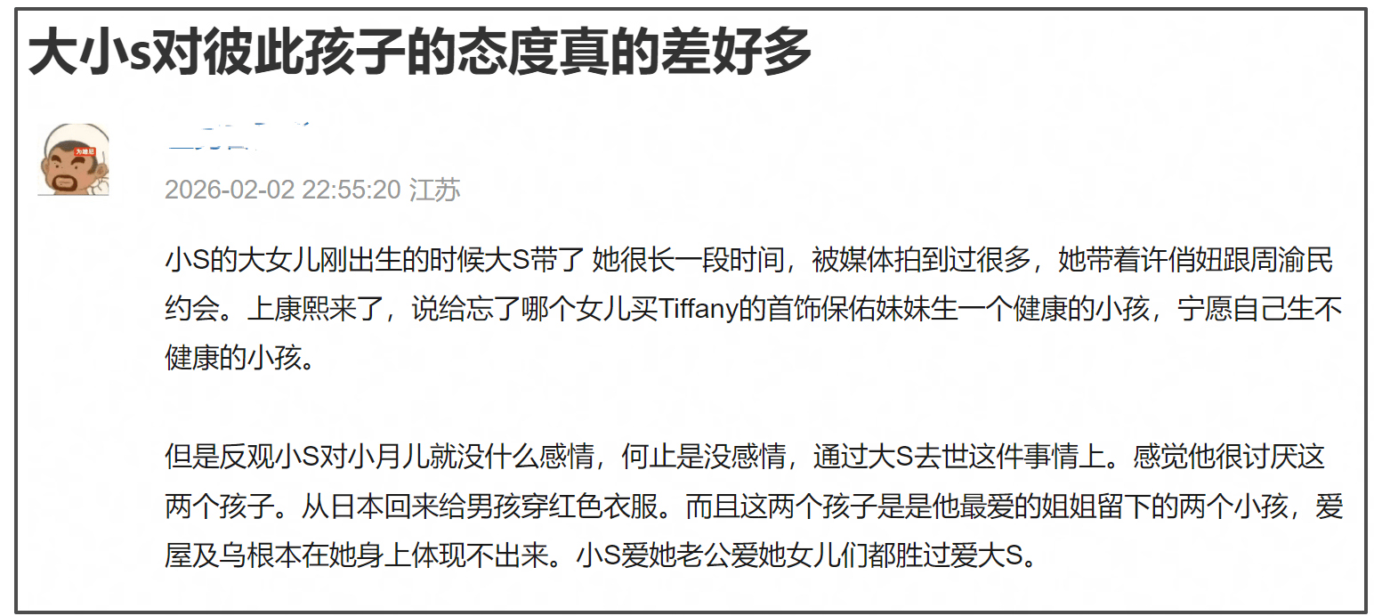 只能说,希望S家以后多多关心一下大S的子女吧,毕竟她最在乎的就是孩子,实实在在的关心,比什么都重要。毕竟孩子才是大S留在世上的唯一骨血。