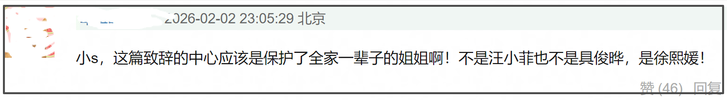 不止把孩子排除在外,S家一直在给具俊晔立深情人设,小S的致辞更是分分钟离不开姐夫,关于大S一生的成就,以及对家庭的付出,对许多人的帮助和善举,丝毫没有提及,只是不断提具俊晔带给大S的温暖和深情,隐隐约约还在拉踩前姐夫汪小菲。