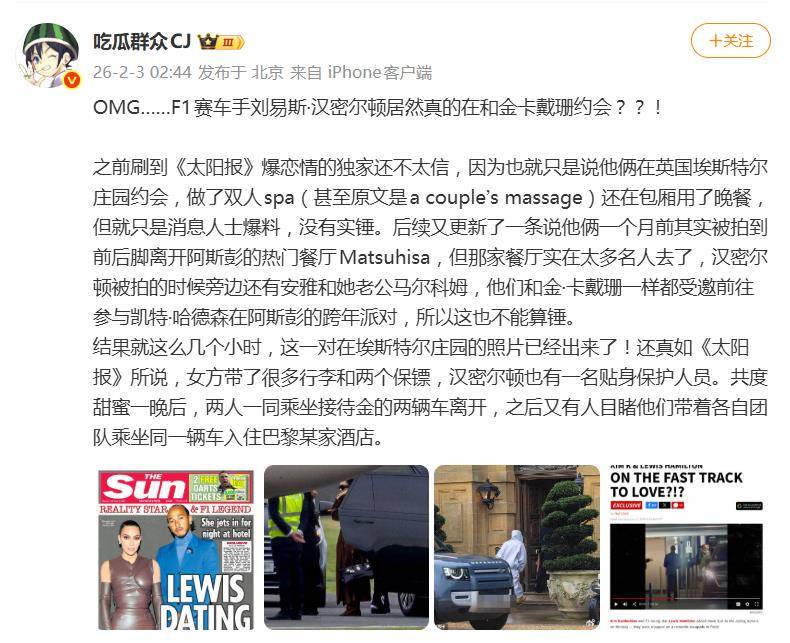 2月3日,欧美八卦圈被一记“重磅炸弹”炸开了锅:真人秀顶流金·卡戴珊与F1赛车传奇刘易斯·汉密尔顿,竟被拍到从英国庄园到巴黎酒店“无缝衔接”的同行画面,一场横跨娱乐圈与体育界的顶级绯闻瞬间点燃全球吃瓜群众的热情。