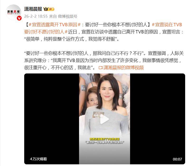 据2月2日报道,最近,TVB前当家花旦宣萱在访谈中的一番坦白,直接撕开了娱乐圈光鲜表皮下的某种“生存法则”。她离开老东家的理由干脆利落,没有含糊其辞的“寻求