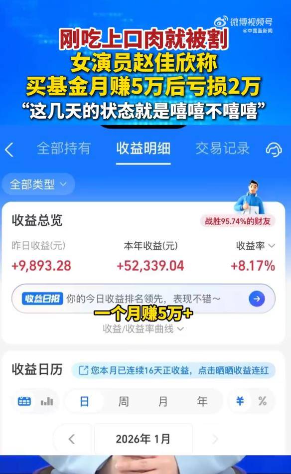 演员赵佳欣近日在社交平台分享的一段投资经历,意外掀起了公众对基金市场波动与普通投资者心态的广泛共鸣。她晒出的收益截图犹如一部微型金融纪录片:从一个月内浮盈超五万元的“沾沾自喜”,到隔日便亏损近两万元的“当头一棒”,其自嘲“刚吃上口肉就被割”,并以“嘻嘻不嘻嘻”形容自己几天的状态,精准刻画了市场剧烈波动下,普通投资者从狂喜跌入焦虑的典型心理落差。