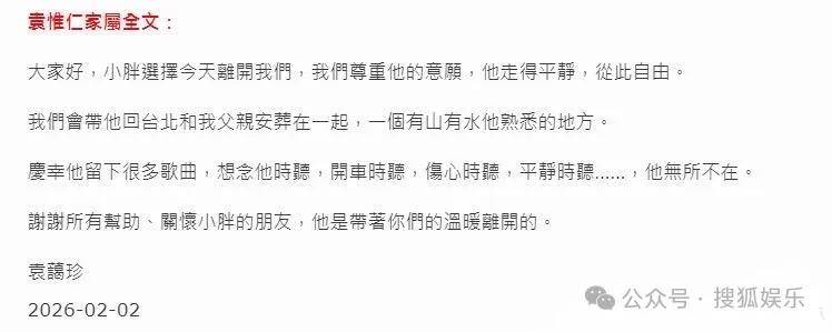 2026年2月2日,袁惟仁的家人以平静的笔触在讣告中写道:“大家好,小胖选择今天离开我们,我们尊重他的意愿,他走得很平静,从此自由。”这位曾经用音符征服无数听众,为华语
