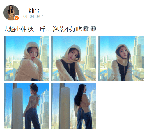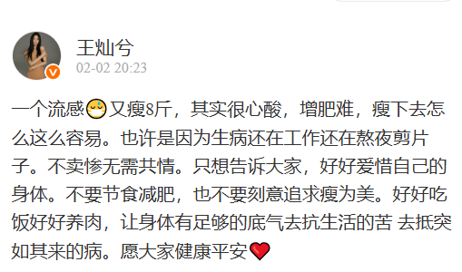 在2月2日,王灿在社交平台上晒出自己感冒做雾化的照片,还配文:一个流感又瘦8斤,增肥难,瘦下去容易,因为这段时间生病没有好好休息熬夜剪片子,所以感冒加重了,其实真不是卖惨主要是易瘦体质。