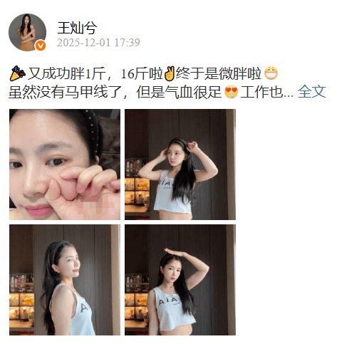 平时杜淳经常带她下馆子吃美食,但养一点点肉好难,最瘦的时候才75斤瘦到皮包骨,还以为过瘦得了肠胃应激症,所以王灿很努力的增肥,增肥16斤有点肉肉感还非常的好看,本来都有90多斤微微胖还挺开心的,结果去趟泡菜国,5天瘦3斤的,现在又因为感冒瘦了8斤。
