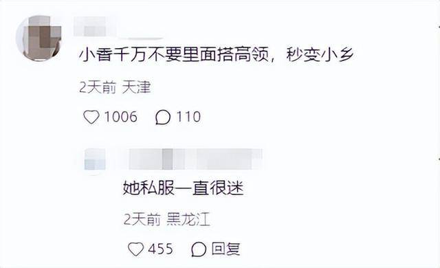 除了状态,穿搭也成了讨论焦点。蓝绿色的小香风,本应该显得她整个人优雅精致,可是突出的高领毛衣却让人出戏,被不少网友吐槽“太俗”。