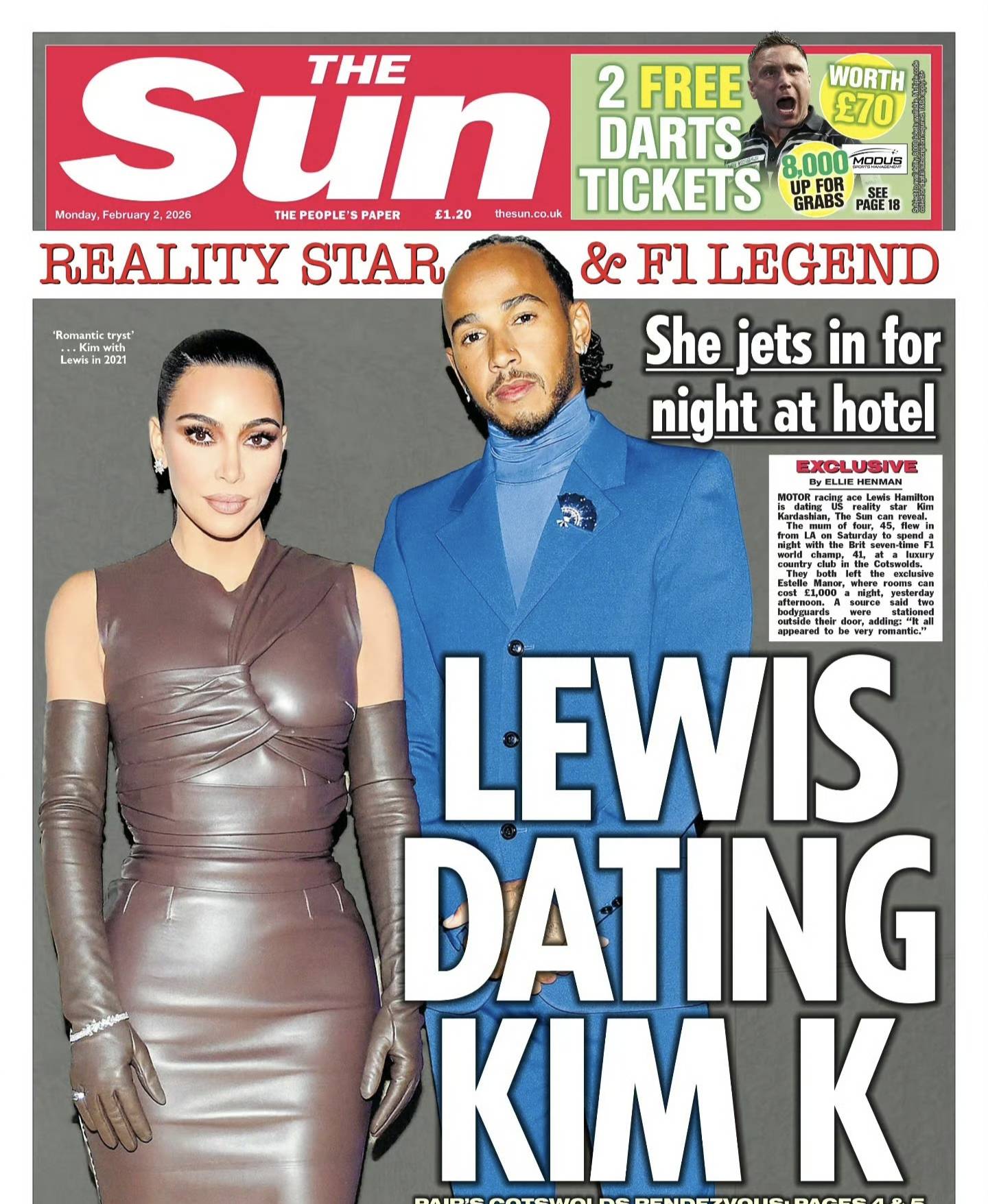 事情是这样的:2月2日《太阳报》头版爆料,说45岁的卡戴珊姐姐乘坐她那架价值1亿英镑的私人飞机从洛杉矶飞抵英国,和41岁的汉密尔顿在牛津郡的埃斯特尔庄园共度良宵。