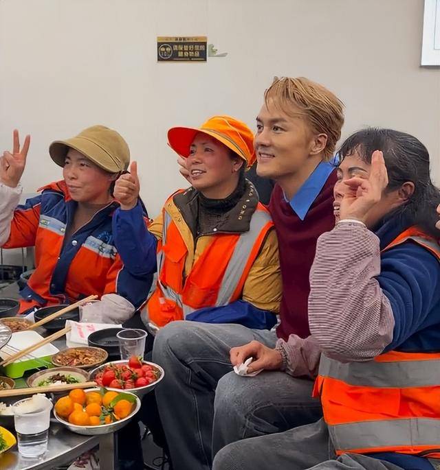 旁边的王师傅是负责这条街的环卫工,后来跟人说“我以为他就是过来拍个照,没想到真坐下来跟我们一起吃,还帮我递了瓶水,一点没觉得自己是明星”。