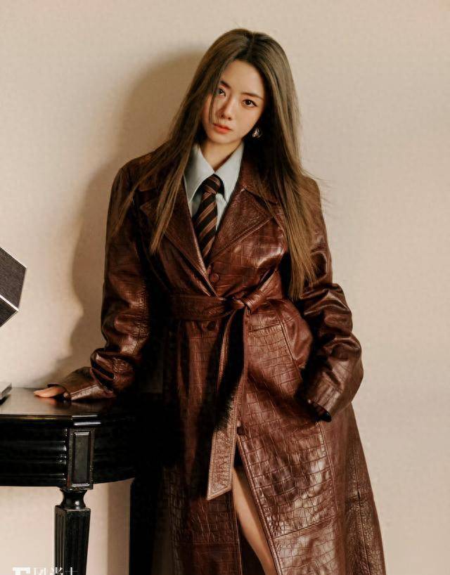 最近看到谭松韵的一组照片,有点被惊到。不是那种常规的惊艳,而是一种很扎实的、从内到外透出来的“稳”。她穿着深棕色的皮质风衣,里面是衬衫和领带,眼神定定地看着
