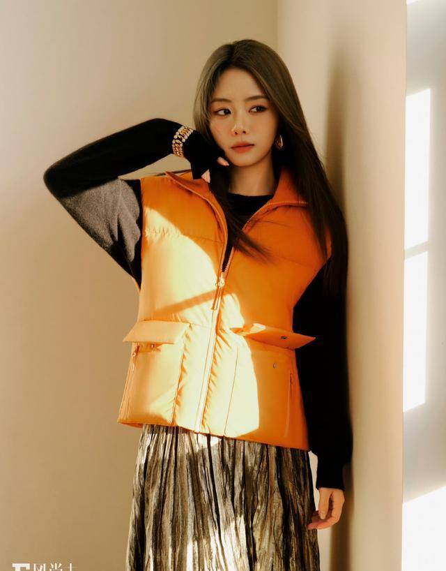 比如她的穿搭。以前总觉得她是邻家女孩模板,现在看她的造型,发现她胆子挺大的。敢穿那种暗黑系的漆皮阔腿裤配铆钉腰带,整个人蹲在那儿,又酷又有点疏离。但转头又能套上一件亮橙色的羽绒马甲,在秋天的落叶堆里笑得没心没肺,少女感立刻拉满。这两种状态放在她身上,竟然不打架。这挺难得的,说明她不是在“扮演”某种风格,而是这些风格本来就在她身体里,只是看今天想放出哪一个。